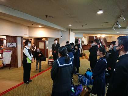先程、無事にホテルに着き、ホテルの方に元気に挨拶をしました。生徒の皆さんは、特に具合の悪くなる人もなく、部屋に入りました。