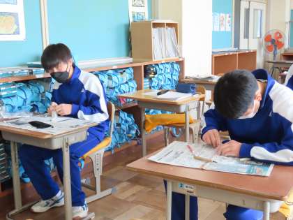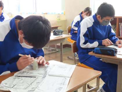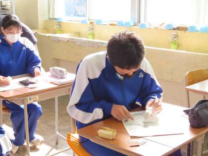美術の授業では、篆刻づくりと、木炭画鑑賞の2つをそれぞれの生徒が、行っています。両方の作品は、生徒の個性が良く現れていると共に、細部まで熱心に作成した様子が見られます。