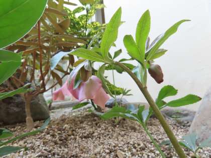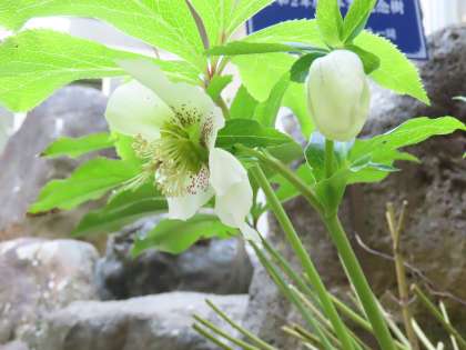 写真中、下:昇降口付近の中庭で花を咲かせているクリスマスローズ(色違い)