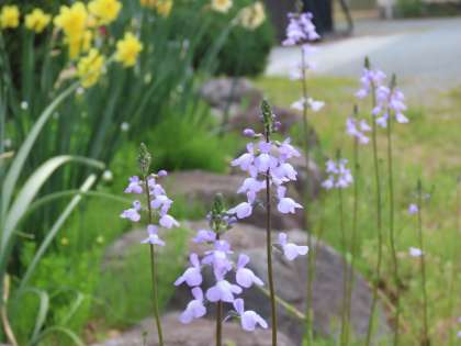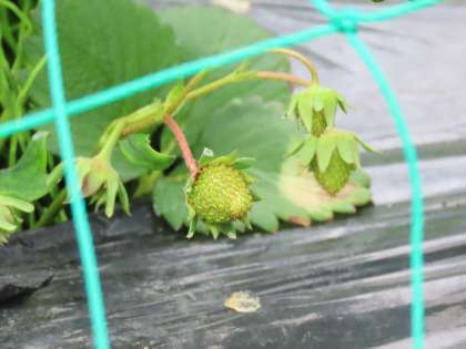 校地内のちょっとした場所にも、野草が生え、花を咲かせています。一方、学校の畑では、苺の花が終わり、果実が実りはじめています。