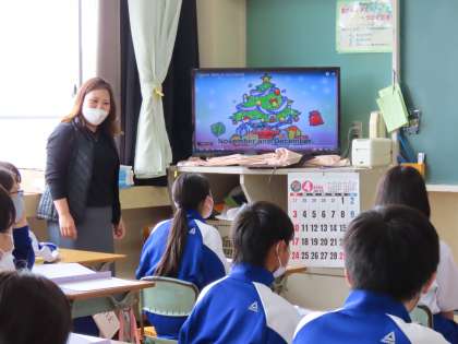 モニターに映し出された映像に合わせて、英語の歌を一緒に歌いました。小学校でも英語に触れていた1年生の皆さんなので、戸惑うことなくきれいな発音で英語の歌を歌っていました。