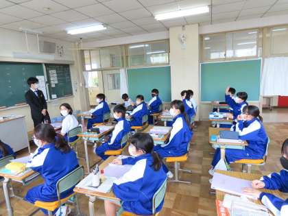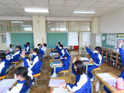 写真は、英語の授業に積極的に参加する1年生の皆さん。