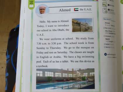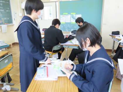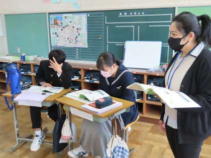 教科書に書いてある英文を覚え、それを発音やアクセントに注意しながら相手に伝える授業を行いました。単純に覚えるだけでなく、伝え方や表現の仕方に注意しながら挑戦しました。