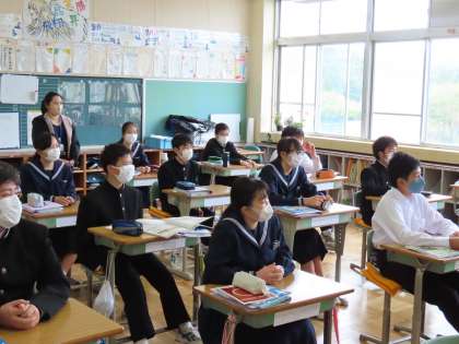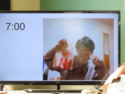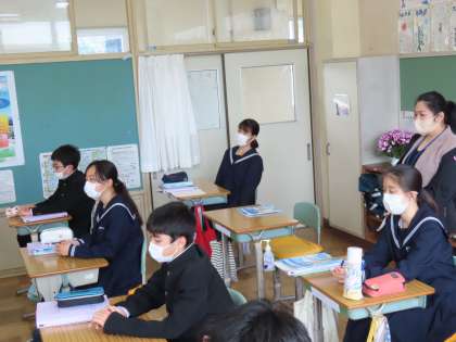 画面に出ている人物が、何時に何を行っているかを見て、それを英語に直して発言する授業を行いました。過去進行形の言い方に注意しながら、はっきり発音するように気をつけました。