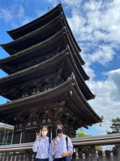 阿修羅像や千手観音像を見学した後、外の五重塔の前でパシャリ!