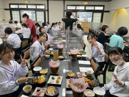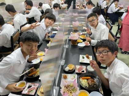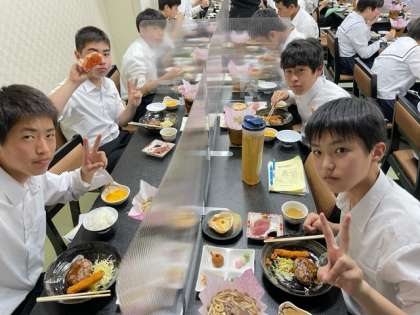 初日の行程を終えて、旅館にて夕食を食べました。この後は小グループごとの入浴と、待ちに待った部屋での思い出作りです。