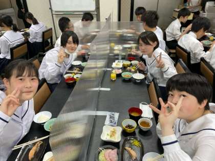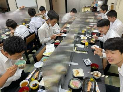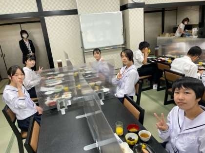 眠気もありそうですが、みんなで元気に朝食です。今日はこの後、クラスごとに京都方面の見学に向かいます。