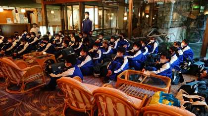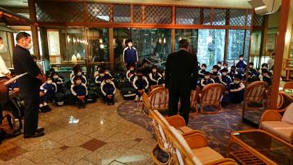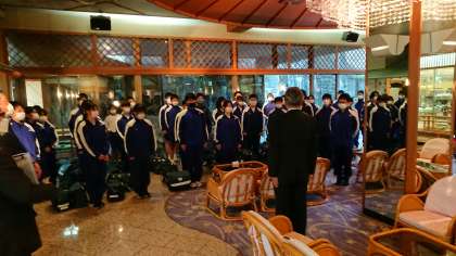 ホテルの方にお話をしてもらい、全員で挨拶をしました。これから各自の部屋に行き、予定通りに食事になります。