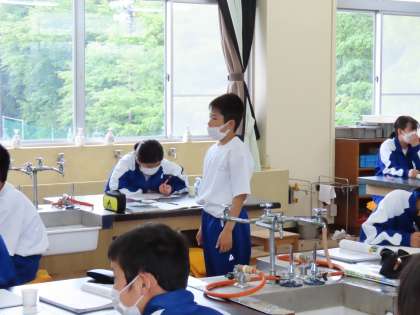 写真は、質問に対して、自分の考えを皆さんに伝える1年生の様子。