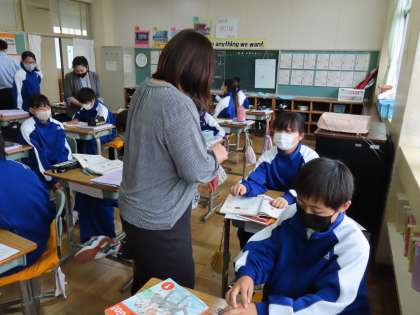 写真は、関わり合いながら、英語を発音する1年生の皆さん。