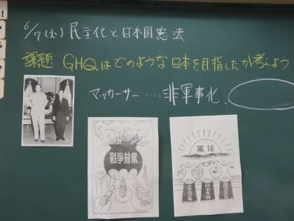 太平洋戦争で敗戦国になった日本は、一時的にアメリカの占領下に置かれ、GHQによって、新しい日本に生まれ変わっていきました。本時では、様々な視点からGHQが日本をどのように変えていこうとしたのか、どんな日本を目指そうとしたのかを、自分の言葉で説明できるような授業を行いました。