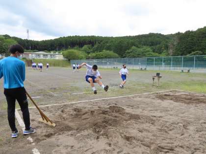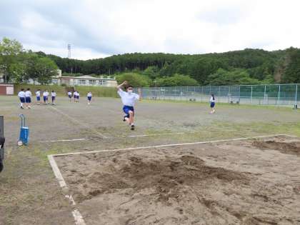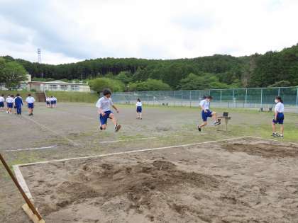 梅雨の晴れ間に、グラウンドを使うことができたので、走り幅跳びを行いました。それぞれが助走の距離や踏み切りの位置を考えながら、種目に取り組みました。