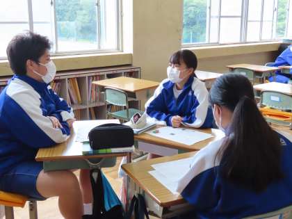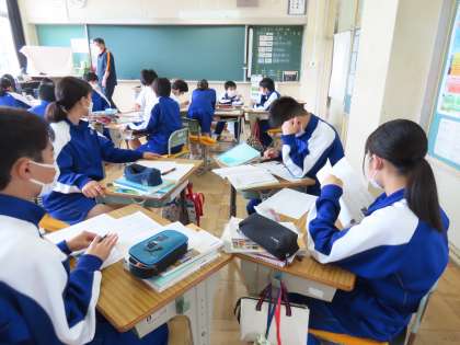 写真上、中:関わり合いながら短歌について学習を進める2年生の皆さん。