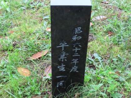 石碑の裏側には、写真のように『昭和62年度 卒業生一同』と刻んでありました。木の種類は、タイサンボク(別名ハクレンボク)だと思うのですが…。
