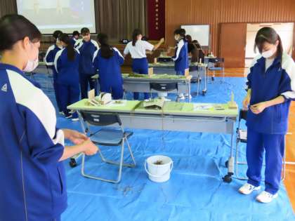 今日は、3年生の美術の学習で、縄文漁網づくりをしました。東京藝術大学から講師を招いて、友だちと協力しながら、丁寧に作っていきます。