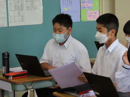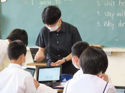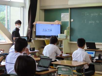 教科書のイラストを使って、ストーリーを英語で表現する授業を行いました。英文を自分の力で組み立てなければならないので、英単語を知っていること、表現する構文の使い方など、様々な知識を活用することになります。