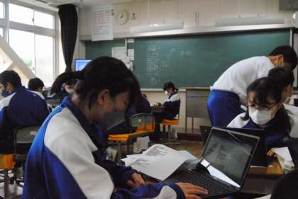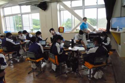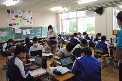 3年生の技術です。スクラッチを使って、プログラミング学習を行いました。命令の出し方一つで、キャラクターの動きが変わっていきます。試行錯誤を繰り返しながら、自分の考えた動きに近づけていきます。