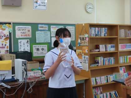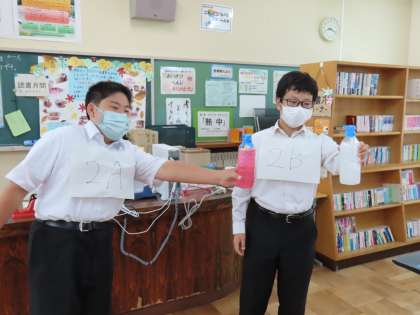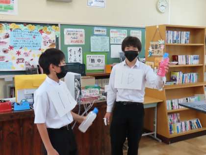 密を避けるために、学級代表者が図書室に集まり、生徒会本部役員さんの指示に従いながら、紅白のくじを引きました。【くじは、透明な水の入ったペットボトルを選び、それを振ると、中の水が紅白どちらかに変わるというものです。】全校生徒の皆さんは、それの様子を教室にて、大画面のオンラインで見ていました。