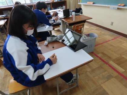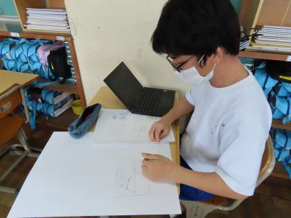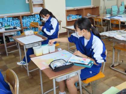 美術の時間には、自分で想像した世界を紙に表現して、作品にするという作業を続けています。生徒の皆さんは、自分のイメージを絵画として表すために、Chromebookの映像からヒントを得たり、スパッタリングやマーブリングといった手法を駆使したりして、作品作りに取り組んでいます。