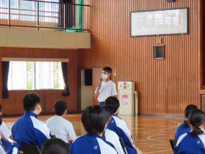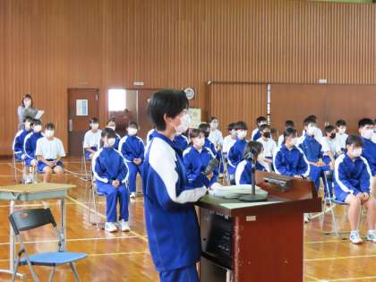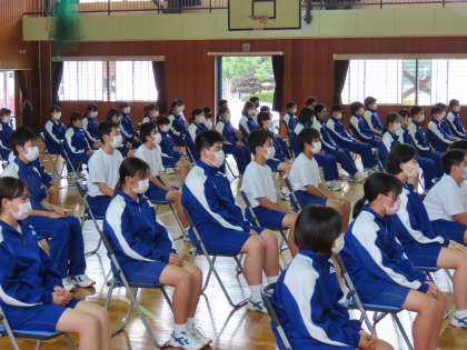 3年生が取り組んでいる、部活動や外部活動の最後の大会が近づいています。最後の大会に向けて1,2年生の応援する気持ちと3年生の意気込みを発表する会を実施しました。