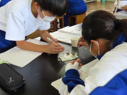 写真は、アサリの体のつくりを調べる実験をする、1年生の皆さん。