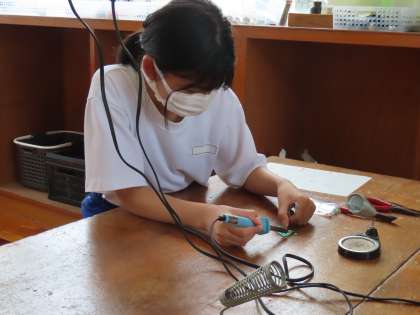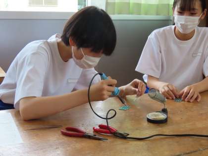 写真は、ハンダ付けの実習を行う2年生の皆さん。
