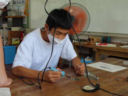 写真は、ハンダ付けの実習を行う2年生の皆さん。