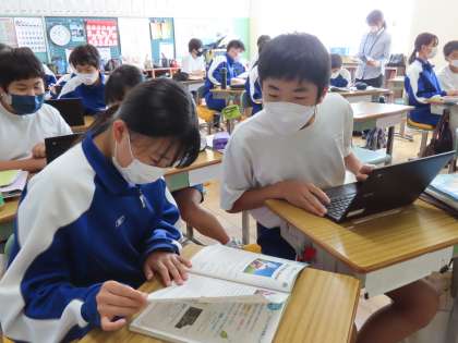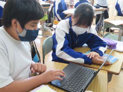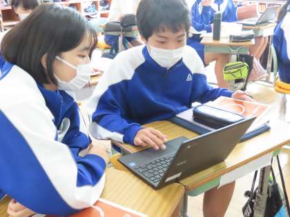 教科担任の先生から、学級の全員にChromebookを使って、問題が送信されました。生徒の皆さんは、ペアになって問題を解いていきます。問題に解答するごとにペアに得点が加算され、モニターに映し出されます。