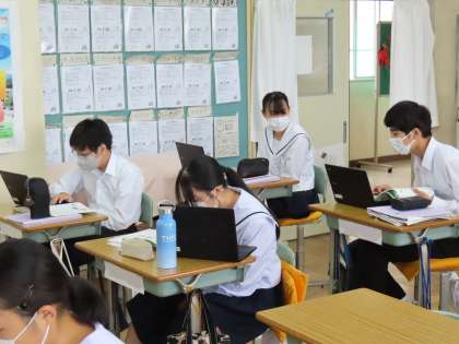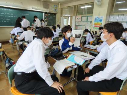 教科書の本文を活用し、速読に挑戦しました。関わり合いながら、お互いの発音を聞き合ったり、Chromebookを使い自分の発音を録音して確認したりと、速くて聞き取れる英文の発音を試みました。