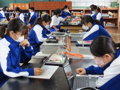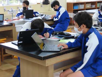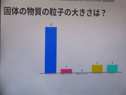 写真上、中:物質の粒子の考え方をChromebookに投票する様子。