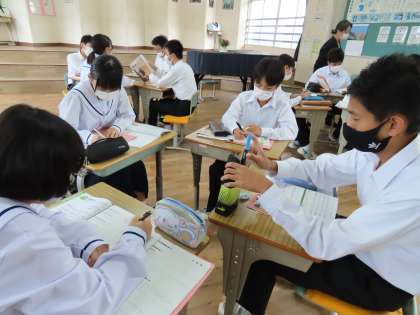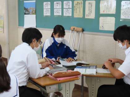 写真は、2つの曲の違いを比べ、曲想について考えている様子。