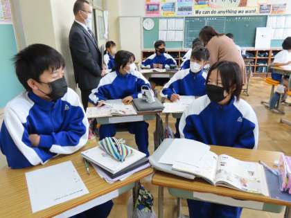 写真は、ペアを作り、英会話文を作成する1年生の皆さん。