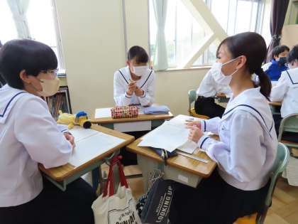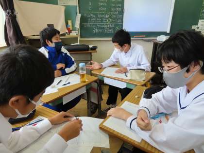 写真は、自分で考えたお勧めの携帯電話プランを、グループ内で発表する様子