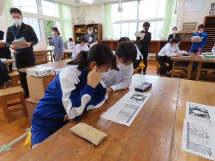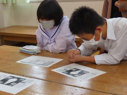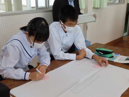 写真下:考えた違いを付箋に書いて、模造紙に貼る様子。