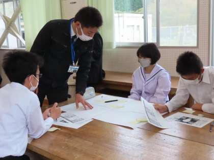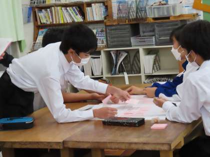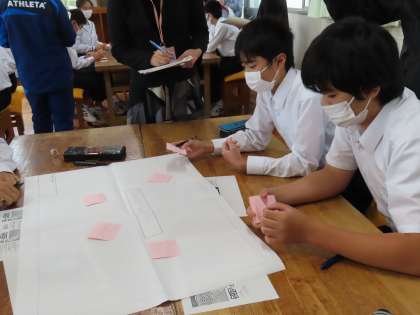 写真は、考えた違いを付箋に書いて、模造紙に貼る様子。