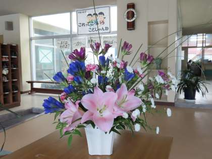 昇降口に、今月のフラワーアレンジメント作品が届きました。作品名は『ファン型 アレンジメント』です。使われている草花は、リンドウ、スプレーカーネーション、ユリ、クジャクソウ、スチールグラス、ソケイです。