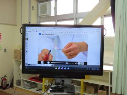 写真上:実験方法を大画面で提示している様子
