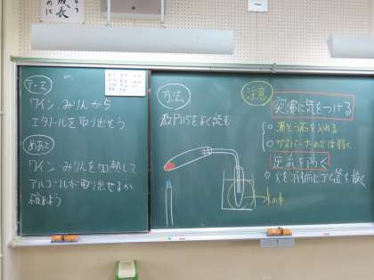 赤ワインとみりんを使い、沸点の違いを利用してアルコールを取り出す実験を行いました。ガスバーナーや沸騰石を使うことや安全な実験手順を学ぶことで、実験の技術向上が期待できますね。