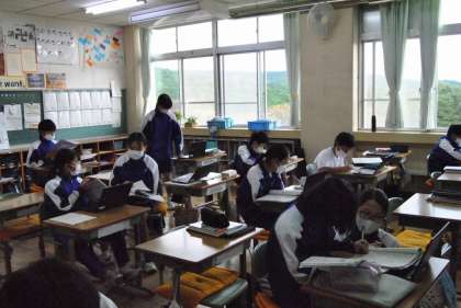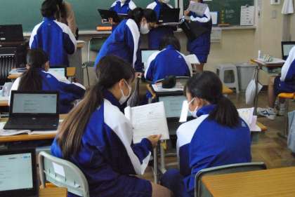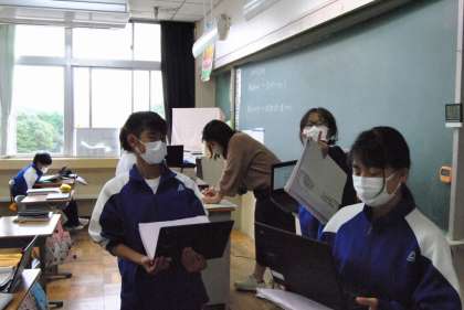 1年生の英語科の授業です。日本語を英訳したり、英訳した文章を教科担任の先生に話したりしていました。友だちとも文章を検討し、練習もしました。上手に話せたかな?