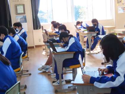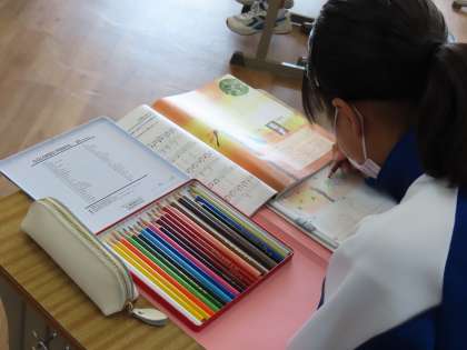 『赤とんぼ』を聴き、曲から感じられるイメージを絵で表しました。人によって曲から感じられるものは異なります。曲から生まれるイメージ画も、生徒の数だけできあがりますね。