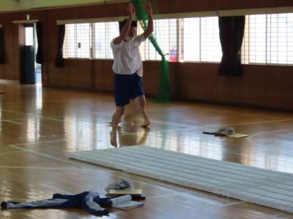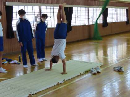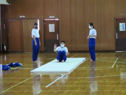 マット運動を行った3年生は、VTRで男子新体操の床運動を視聴しました。そこで、マット運動を発展させ、簡単な創作演技を考える授業を行いました。