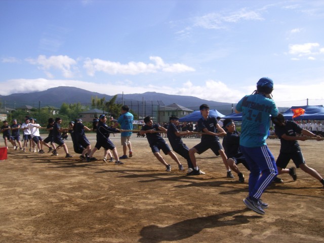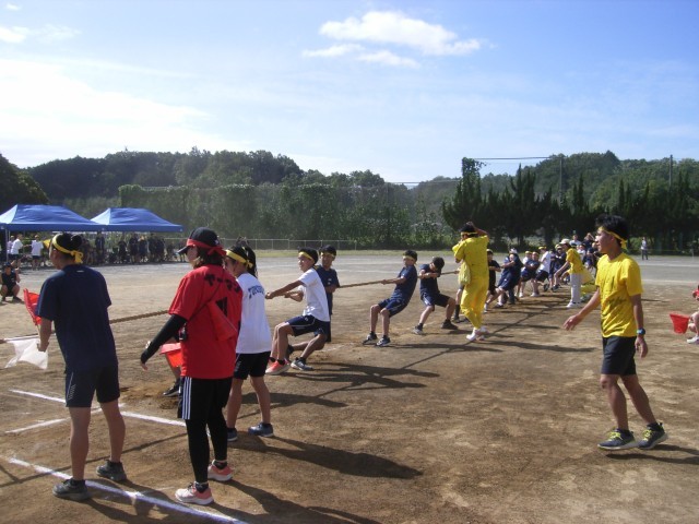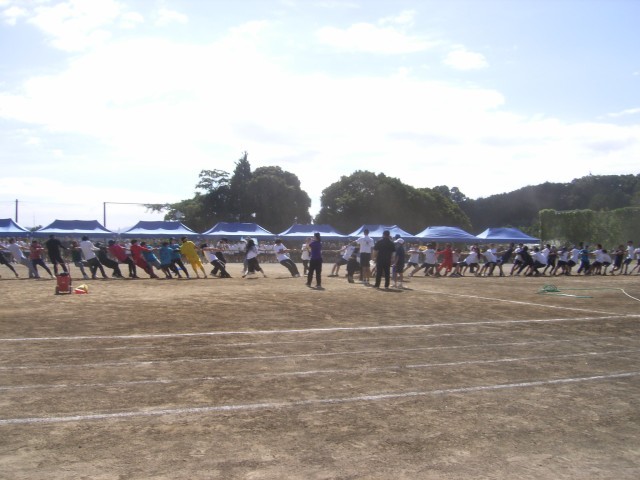 それぞれのカラーが1勝ずつで迎えた最後のカラー種目、綱引きは、青カラーが勝ちました。これで、青カラー340点、黄カラー320点、赤カラー300点と青カラーが総合優勝でも一歩、リードです。しかし、優勝の行方はまだまだわかりません。このあと、PTAの皆さんと3年生が綱引きで勝負をしました。PTAの皆さんが2勝して勝ちました。さすがです。3年生からもう一回勝負させてほしいとのお願いで、再勝負をして今度は3年生が勝ちました。