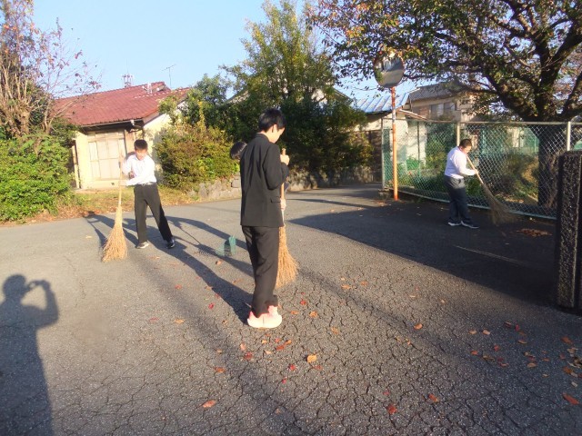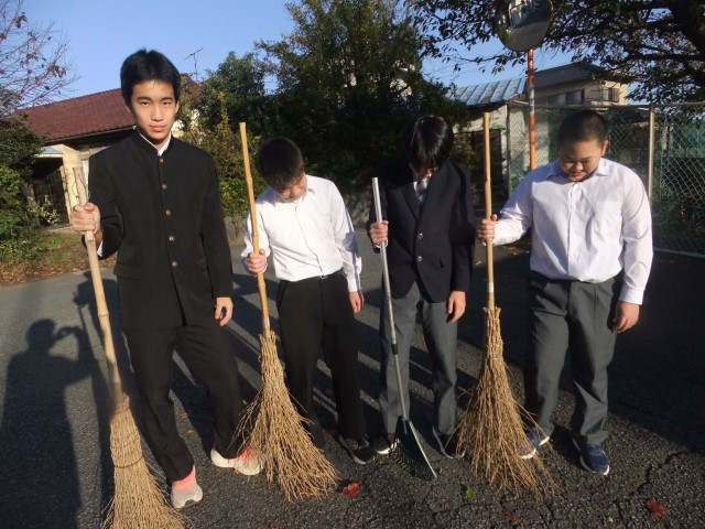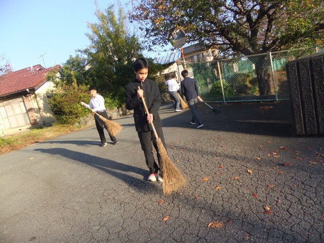 ボランティアで校門付近の落ち葉を掃いてくれている3年生がいます。