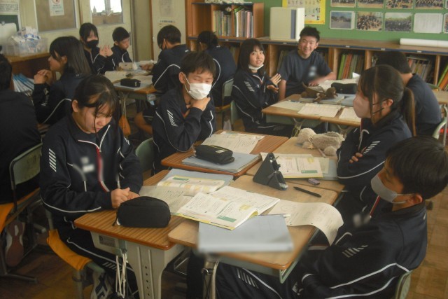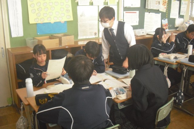 円について、学習しています。弧や弦、接線がどのようなものか、学んでいく中で、「交わる」と「接する」がどのように違うのか、という疑問が出てきました。そこで、自分たちで説明できるように、グループでの話し合いが始まりました。身振りなどを含めて、納得のいく説明ができるように取り組んでいました。