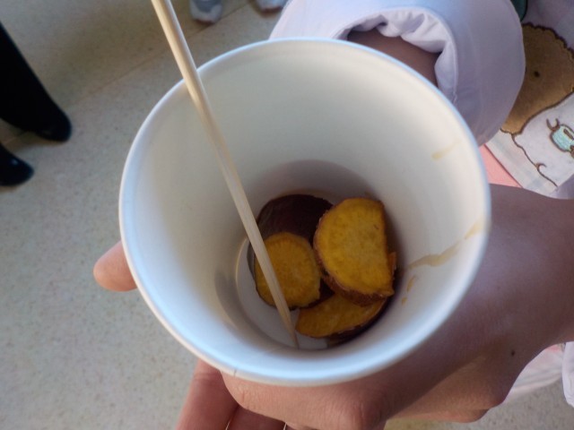 さつまいもが繰り出す柔らかな甘みに包まれ、午前中の疲れが一気に吹き飛んだ!!たまに食べる大学芋とはちがう。富中生が作ってくれた大学芋に、価値があるのだ!!じつにうまい、、、。