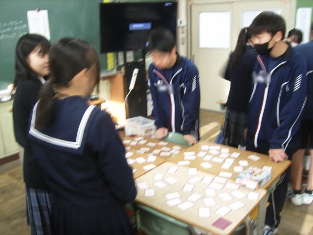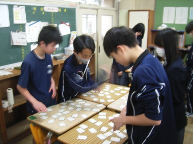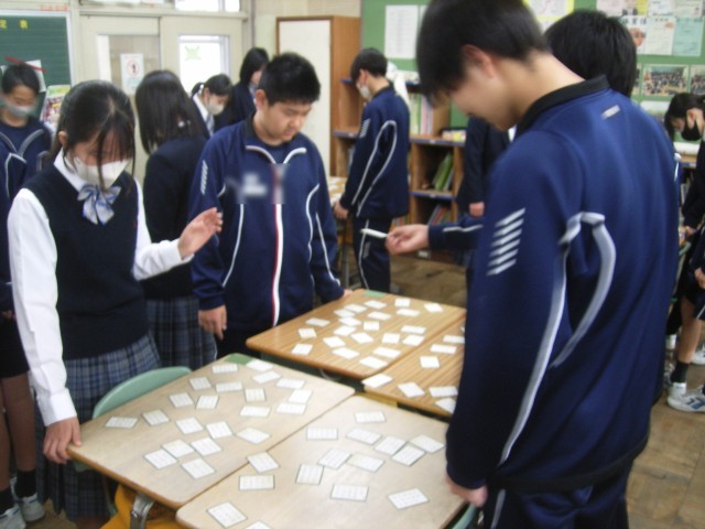 古典は、中学生にとっては難しく遠い存在になりがちです。百人一首は、リズムがよく、音読もしやすく、親しみやすいです。かるたになると、友達と楽しみながら、作品に触れあっていくことができます。和気あいあいとした雰囲気の中で、百人一首に親しんでいました。