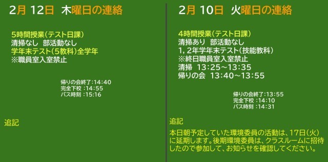 2年生は、2学級が学級閉鎖中のため、学年末テスト(技能教科)は13日(金)に延期しました。1年生は予定通り実施します。