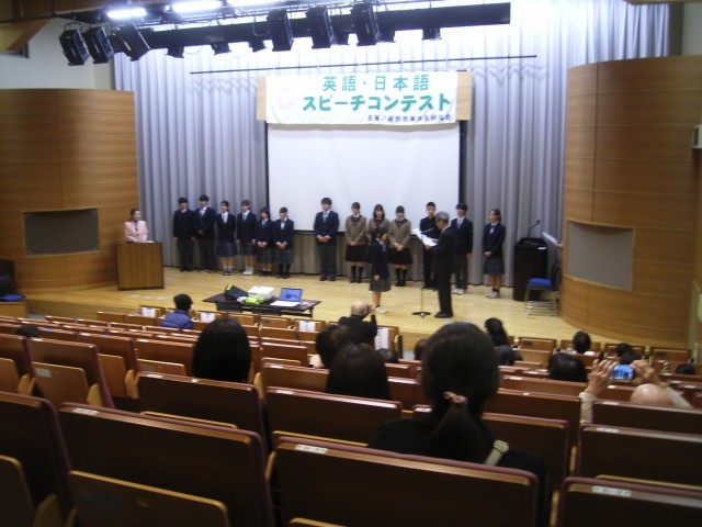2月14日の土曜日に、裾野市生涯学習センター多目的ホールにおいて、裾野市海外友好協会主催の「第43回英語スピーチコンテスト・日本語スピーチ」が開催されました。市内の中学校6校から14名の生徒が参加し、行われました。本校からも学校の代表として2名の生徒が参加し、発表を行いました。発音、内容ともに素晴らしく、日頃の学習の成果を活かした、とても立派な発表でした。