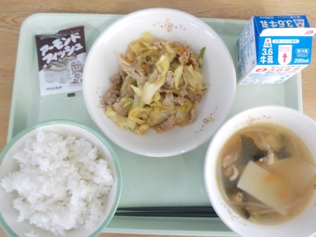 ほほう、、、今日は中華の布陣か!今日はすぐに食べる前に、全体を俯瞰してみてみよう。ホイコーローを中央に鎮座させる。やはり、今日の主役の風格が漂ってくる。ワンタンスープはやや右前、静かなる実力者といったところか。ごはんは左手前、いつでもホイコーと合体するチャンスを狙っている。牛乳は締めに、小魚アーモンドは伏兵といったところか。しかし箸はまだ動かさない。“作戦”を立てる時間だ。