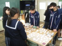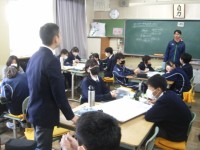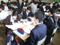 岩石の学習をしている1年生。鉱物の様子を顕微鏡で見たら、どんなふうに見えるかの説明を聞いています。今日は特別講師の先生も授業に入っていただいています。「これ、顕微鏡だよ」「へえ〜」代表の生徒がのぞき込んでレポーター役になっています。